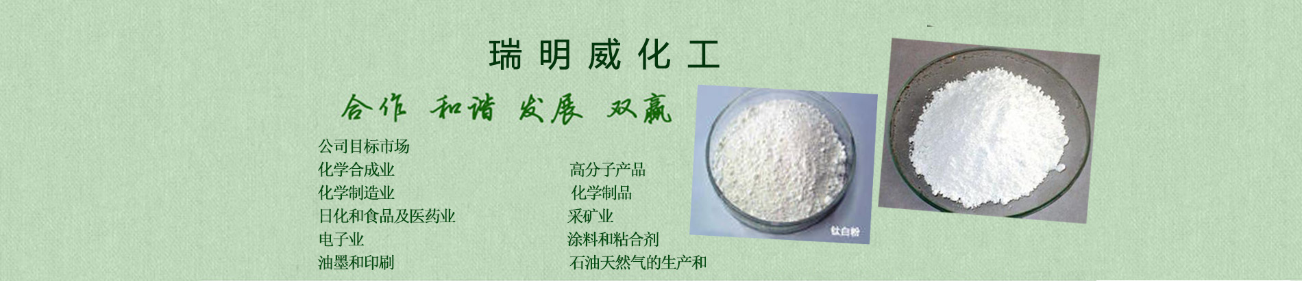 天津市瑞明威化工有限公司公司概況公司本著“興業、興人、興社會”的三興企業文化在業內有著崇高的聲譽產品覆蓋面大,銷售輻射華東、華南、華北數百種產品,多種銷售模式可供選擇華東、華北、沿海、沿江長期包租有儲罐和倉庫提供個性化的完全服務,解決用戶在化學品使用中的一切煩惱供應鏈外包 個性化定裝與標簽 來料加工業務 分包裝 化工超市 買方庫存管理公司目標市場化學合成業 高分子產品化學制造業 化學制品日化和食品及藥業 采礦業電子業 涂料和粘合劑油墨和印刷 石油天然的生產和提煉